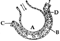 Q. 79. The figure given below shows a small part of human lung where exchange of gases takes place. In which one of the options given below, the one part A, B, C or D is correctly identified along with its function?