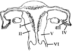 Q. 82. The figure given below depicts a diagrammatic sectional view of the female reproductive system of humans.Which one set of three parts out of I – VI have been correctly identified?