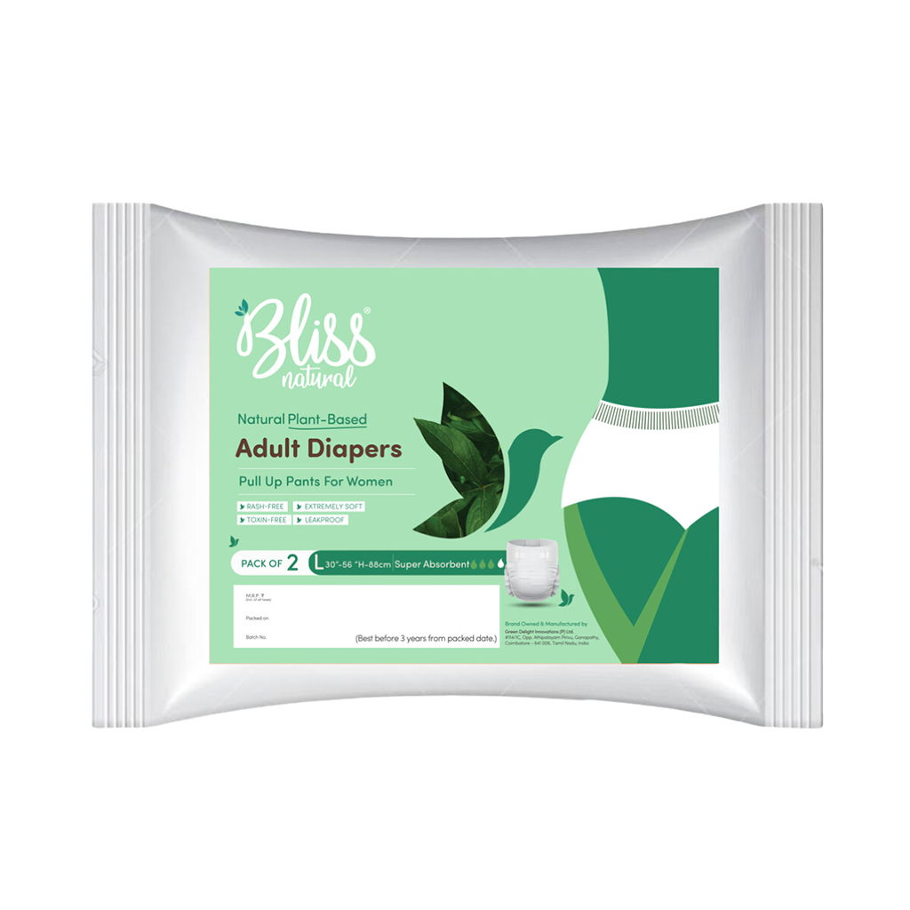 Bliss Natural is a complete Women's Intimate Hygiene Product Brand in India. It was founded in 2018. The product's main advantage is that it is completely plastic-free. Bliss Natural Organic Adult Diaper Pants are made in India. They are fully made of all-natural materials and ingredients (Kenaf), making them a unique concept compared with other pads. The main advantage is that they are organic with extremely soft, leakproof protection and high absorbency.