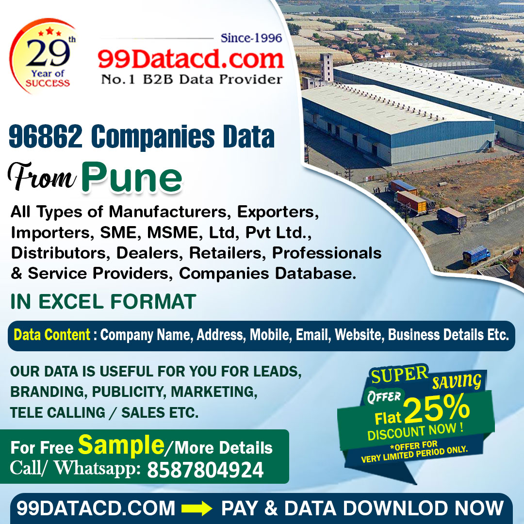 Looking for Manufacturing Companies in Pune? 99Datacd offers a list of companies in Pune, an effective lead generation tool for marketing individuals. Our data list benefits for SMEs, MSMEs, Corporates, FMCG exporters, importers, distributors, professionals, dealers, and manufacturers. It includes essential details such as company name, address, city, pin code, state, mobile number, email ID, website, and business Details. Purchase our business-to-business industrial data today and accomplish your organisational goal.