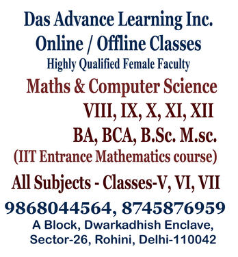 Coaching of Mathematics & Computer Science with female Math & Computer science teacher for ix, x, xi, xii, BCA, B.Sc., M.Sc... Specialized tuition for 9, 10, 11 & 12 classes and has proved to be an undisputed leadership in the field of Maths & Computer Contact – 9868044564, 8745876959-A block, sector-26, Rohini, Delhi-110042. . Dwarkadhish Enclave,