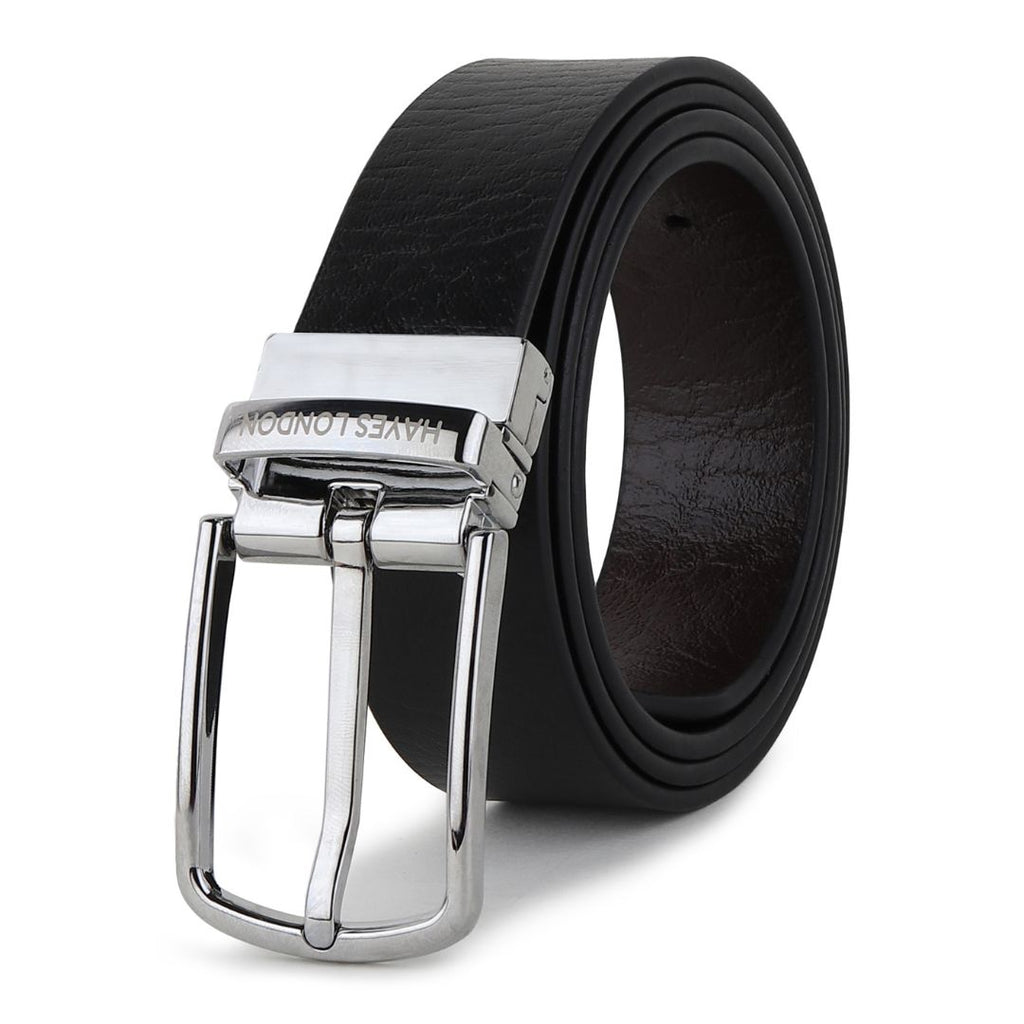 Discover versatility with Hayes London's Genuine Leather Reversible Belt for men. Black and brown hues blend seamlessly in wild leather texture, complemented by a stylish silver buckle.