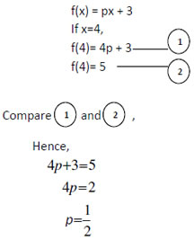 | 2. Given that f(x) = px + 3 and f(4)= 5. Find the value of p. |
