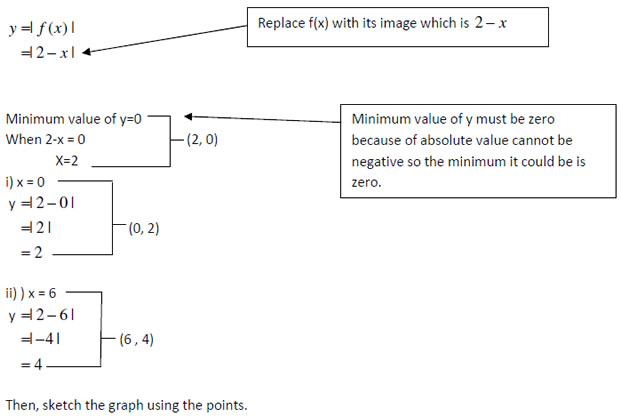 Given f (x) = 2 − x and y =| f (x) | . Sketch the graph of y =| f (x) | for the domain 0 ≤ x ≤ 6. Hence
