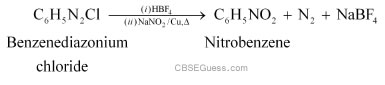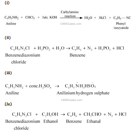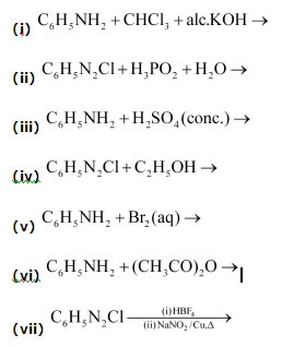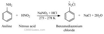 (i) Aromatic amines react with nitrous acid (prepared in situ from NaNO2 and a mineral acid such as HCl) at 273 − 278 K to form stable aromatic diazonium salts i.e., NaCl and H2O.