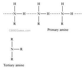 (ii) In a molecule of tertiary amine, there are no H−atoms whereas in primary amines, two hydrogen atoms are present. Due to the presence of H−atoms, primary amines undergo extensive intermolecular H−bonding.