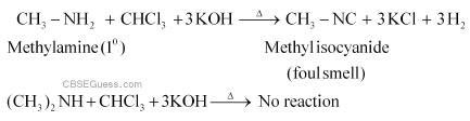 Carbylamine test: Aliphatic and aromatic primary amines on heating with chloroform and ethanolic potassium hydroxide form foul-smelling isocyanides or carbylamines. Methylamine (being an aliphatic primary amine) gives a positive carbylamine test, but dimethylamine does not.