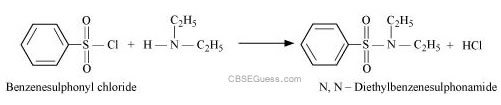 (ii) Secondary and tertiary amines can be distinguished by allowing them to react with Hinsberg’s reagent (benzenesulphonyl chloride, C6H5SO2Cl). Secondary amines react with Hinsberg’s reagent to form a product that is insoluble in an alkali. For example, N, N−diethylamine reacts with Hinsberg’s reagent to form N, N−diethylbenzenesulphonamide, which is insoluble in an alkali. Tertiary amines, however, do not react with Hinsberg’s reagent.