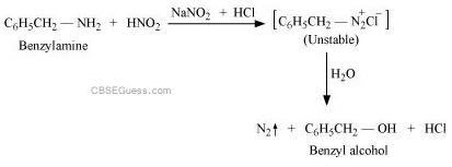 (iv) Aniline and benzylamine can be distinguished by their reactions with the help of nitrous acid, which is prepared in situ from a mineral acid and sodium nitrite. Benzylamine reacts with nitrous acid to form unstable diazonium salt, which in turn gives alcohol with the evolution of nitrogen gas.