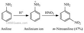 (iv) Although amino group is o,p− directing in aromatic electrophilic substitution reactions, aniline on nitration gives a substantial amount of m-nitroaniline: