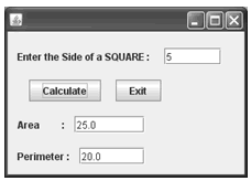 (a) Design a GUI desktop application in java to accept the side of a square in a text field and calculate the area and perimeter of the square. Display the results in two separate text fields. Add appropriate labels and an exit button to end the application.