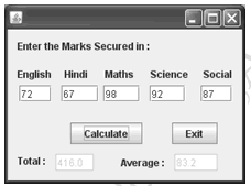 (b) Design a GUI desktop application in java to accept marks in 5 subjects in five text fields and calculate the total and average marks. Display the results in separate text fields, which are disabled. Add appropriate labels and an exit button to end the application.
