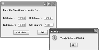 (c) Design a GUI desktop application in java to accept sales of a company for four quarters in text fields. Calculate the total yearly sale and display the same in a dialog box. Add appropriate labels and an exit button to end the application.