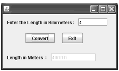 (d) Design a GUI desktop application in java to accept length in kilometers in a text field and display the converted length in meters in a second text field which is disabled. Add appropriate labels and an exit button to end the application