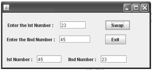 (e) Design a GUI desktop application in java to accept two numbers in a in a text field and Interchange the values of first number and second number using a temporary variable. Add appropriate labels and an exit button to end the application.