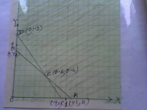 These lines meet at E (0.6, 0.4). The feasible region is shaded and it is an unbounded region with vertices A (1.1, 0), E (0.6, 0.4) and D (0, 1.2).
