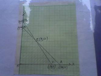 CBSE Guess > Papers > Important Questions > Class XII > 2010 > Maths > Mathematics By Mr. M.P.Keshari Linear Programming Q.12. A dealer wishes to purchase a number of fans and sewing machines. He has only Rs5,760 to invest and has space for at most 20 items. A fan cost him Rs360 and a sewing machine Rs240. He expects to sell a fan at a profit of Rs22 and a sewing machine at a profit of Rs18. Assuming that he can sell all the atoms that he buys, how should he invest his money to maximize the profit ? Solve graphically and find the maximum profit. Solution : Let x be the number of fans and y the number of sewing machines (bought and sold). According to the hypothesis , the linear programming problem is :