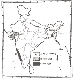 (b) On the given outline map of India, identify the features marked as A, B and with the help of the maps legend and write their names correctly in the space provided. 3 x 1=3