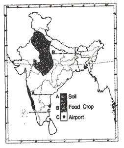 (c) Study the map of India given below and identify the features marked A, B and C and write their names correctly in the space provided. 3